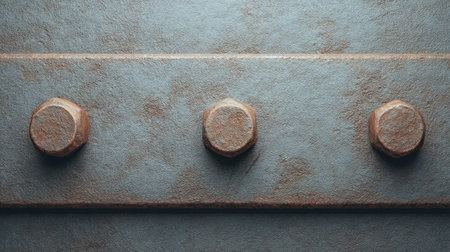 This image features a close-up view of rusty steel bolts on a metal plate, showcasing the weathered surface and intricate texture that convey industrial strength and durability.