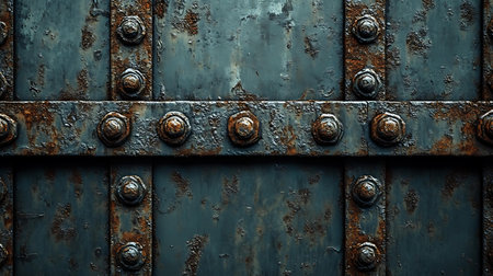 This image showcases a detailed textured metal surface featuring rivets and bolts, ideal for industrial design projects, backgrounds, or decor.