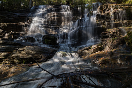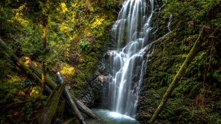 Beautiful cascading waterfall with fallen trees and moss on rocks.