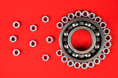 Roller bearing and nuts on a red background. Spare parts.