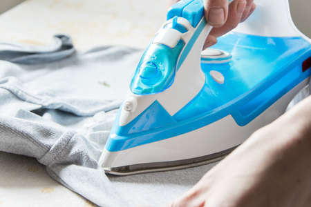 Clothing ironing at home. Young girl is ironing garments at home. Female hand is ironing clothes, close up.