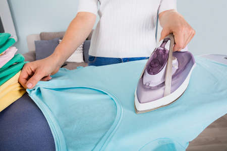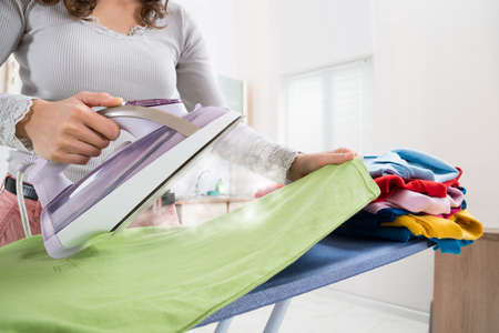 Woman hand Ironing Clothes With Iron On Ironing Board After Laundry At Home