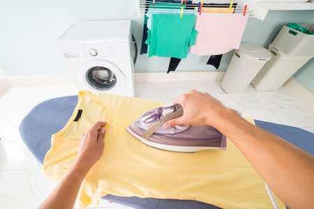 A housewife irons a yellow T-shirt with an iron. Ironing clothes at home, caring for clothes. Hands close-up