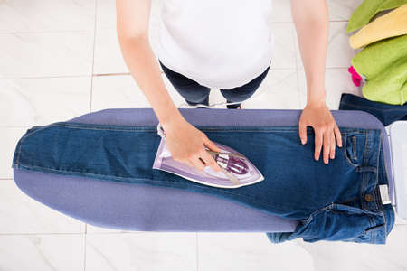 High Angle View Of Young Woman Ironing Jeans On Ironing Board At Home