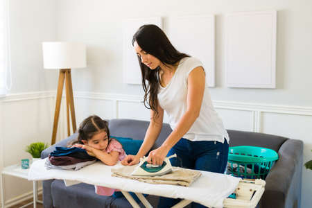 Loving mother ironing clothes after laundry and doing housework in the living room with her bored little daughter