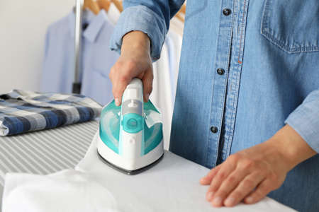 Woman ironing clothes at home, closeup