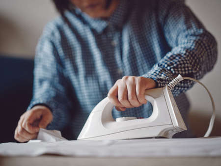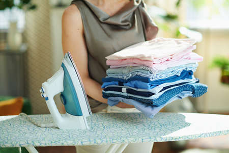 Mature lady ironing clean apparel while doing household chores in cozy light room at home. Close up