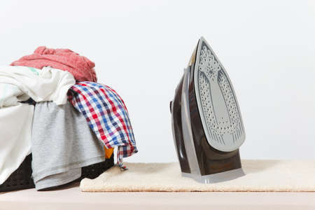 Household laundry ironing concept. Iron with clothes top view