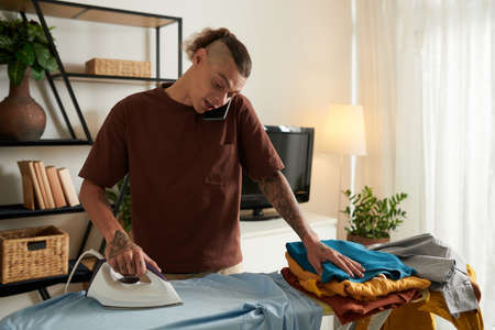Serious young man talking on phone with friend or colleague and ironing clothes