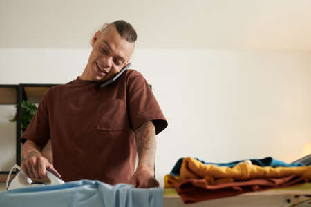 Cheerful young man ironing clothes and discussing news with friend on phone