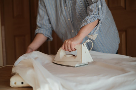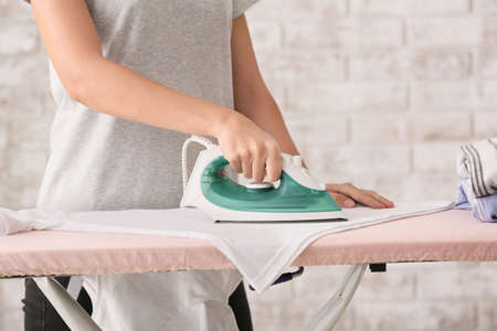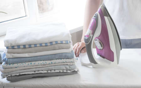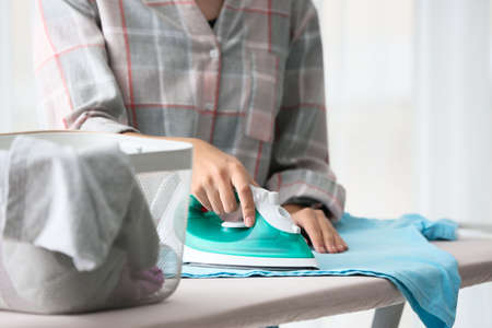 Female hand ironing clothes on iron board at home in the laundry day.