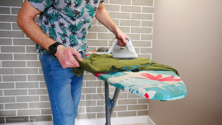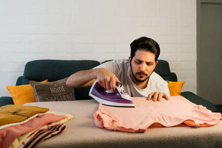 Professional Service. Man at home ironing clothes. house husband. Housekeeping. mature young man husband doing clothing ironing at home. hot and evaporation. modern life innovation