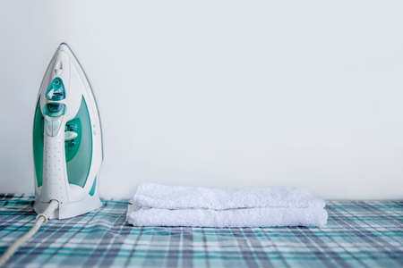 Household laundry ironing. Iron on table on white background, Copy Space.