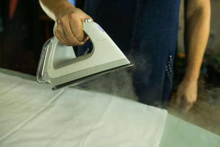 Homework. Close-up, woman ironing clothes with an iron on an ironing board after washing. The steam jet is clearly visible in the photo.