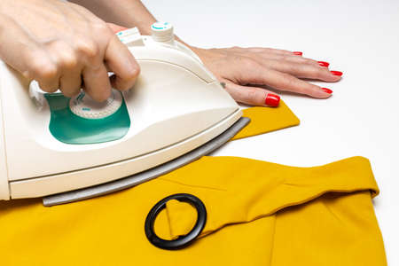 a woman irons a belt from a women's skirt with an iron. high quality photo