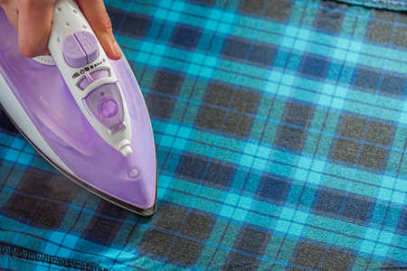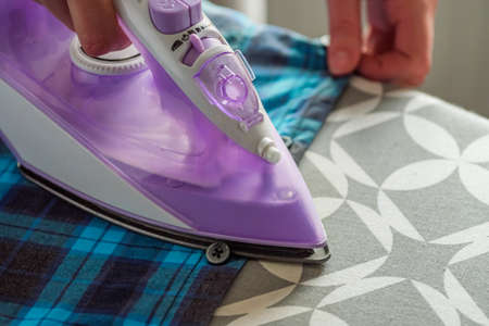 A woman hand with a dark blue iron and an ironing board, close-up