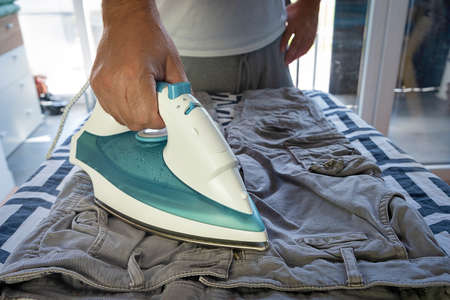 Ironing and steaming clothes with an iron. Pants and tennis shirt.