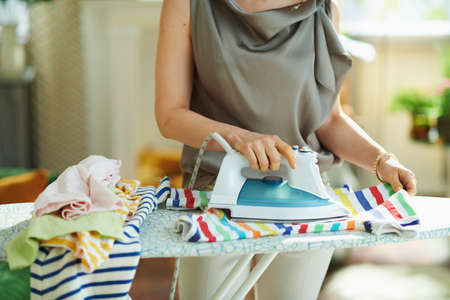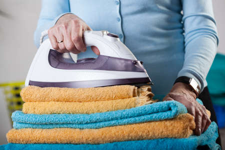 Mature lady ironing clean apparel while doing household chores in cozy light room at home. Close up