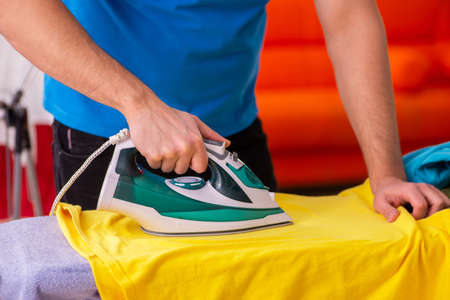 A housewife irons a yellow T-shirt with an iron. Ironing clothes at home, caring for clothes. Hands close-up