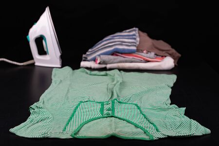 New modern electric steam iron and a stack of ironed t-shirts of various colors on ironing board on a brick wall