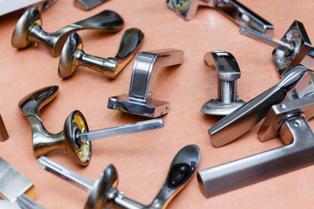 High-quality furniture fittings arranged on white background. Sleek cabinet handles, sturdy hinges, and drawer slides. Concept of home renovation, furniture assembly, cabinet making, minimalist design