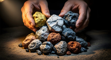 A mining worker hand ore mineral rock holding raw metal chunks in dusty palms, documentary closeup of extraction labor and grit