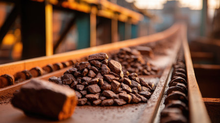 This industrial scene showcases a detailed view of rocks piled on a conveyor belt at a mining facility. Warm natural light enhances the textures.