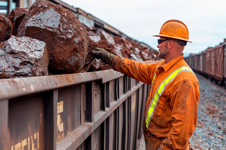 Under a gray sky, a dedicated worker in safety gear examines a cargo train filled with large rocks, showcasing the effort and care involved in handling heavy materials in transit.