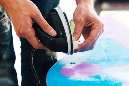 man is careful waxing with the help of iron the colorful snowboard