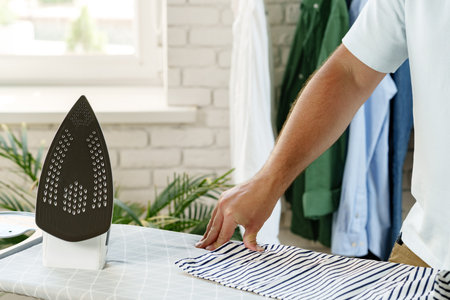 No wrinkled clothing. Close up of woman ironing clothes on ironing board at home
