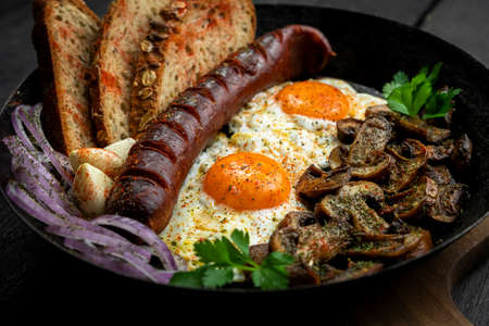 Breakfast set with eggs, sausage, toasts and fresh vegetable on rustic wooden table