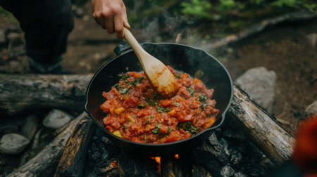 A hand stirring a vibrant vegetable stew in a cast iron pot over a campfire, surrounded by nature. This scene captures the essence of outdoor cooking and communal sharing of a delicious meal.