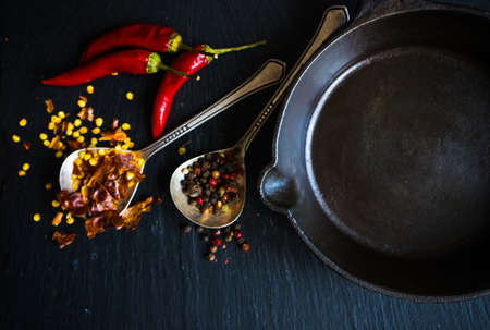 Various organic spices, herbs and ingredients around empty aged cooking skillet. Black background. top view. copyspace.