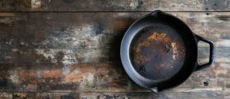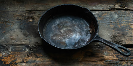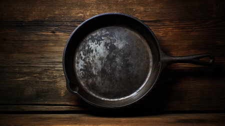 A worn cast iron skillet rests on a rustic wooden surface showcasing its age and use. The natural textures contrast beautifully.