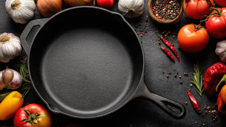 A cast iron pan sits empty in a rustic kitchen, surrounded by fresh vegetables and spices. The vibrant colors of ingredients showcase healthy cooking and meal preparation, inspiring culinary creativity.