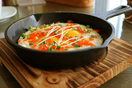 fried eggs baked breakfast served in cast iron fry pan on wooden tray