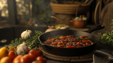 A cast iron pan filled with simmering meat and colorful vegetables in a cozy rustic kitchen, showcasing the art of home cooking and fresh ingredients.