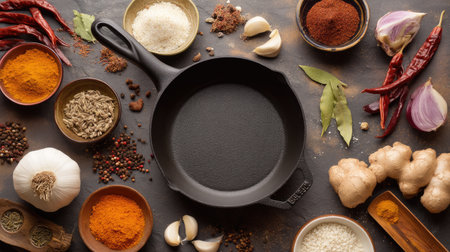 A cast iron skillet is surrounded by an array of spices, herbs, and fresh ingredients on a rustic wooden surface, showcasing colors and textures perfect for culinary art.