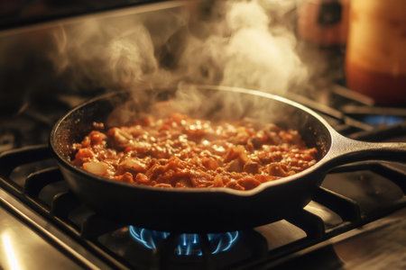 Aromatic steam rising from a hearty stew simmering in a cast iron skillet on a gas stove, creating a cozy and inviting culinary scene