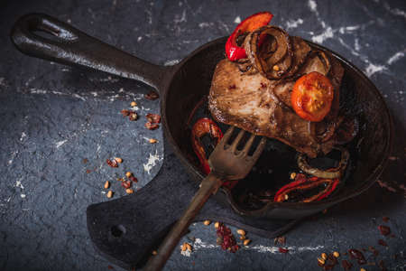 Breakfast in a cast-iron pan: delicious fried eggs, tomatoes and fried meat