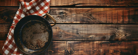 Overhead view of a rustic wooden table featuring a checkered tablecloth and an old, worn pan. The scene is perfect for evoking a sense of nostalgia and warmth.
