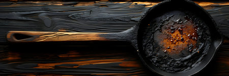 Frying pan with burnt food on black wooden background. Top view
