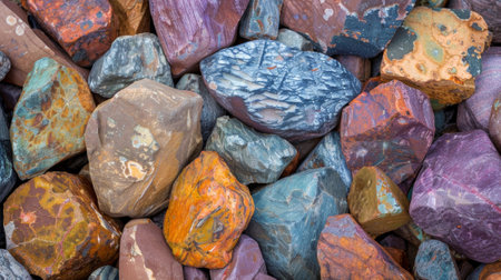 Various rocks of different sizes and colors arranged in a group, creating a textured and vibrant display.