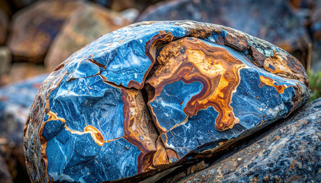 A rounded rock with blue and orange swirling patterns and prominent cracks on its surface.
