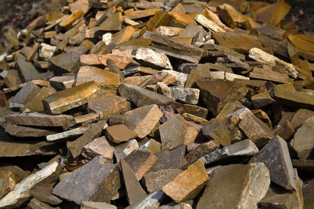 Close-up showcases a dense assortment of irregularly shaped rocks, varying in shades of brown, grey, and blue. Varied textures and natural patterns are visible across the rocks.