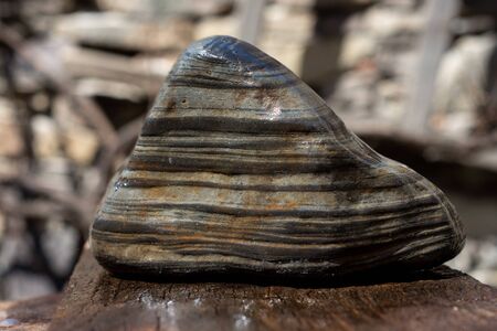 A smooth, multicolored stone rests elegantly on a weathered wooden surface, highlighting the beauty of natural textures and earthy tones in a serene setting.