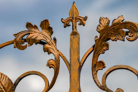 Details, structure and ornaments of forged iron gate. Floral decorative ornament, made from metal. Vintage metallic pattern. Decorative elements as a background.
