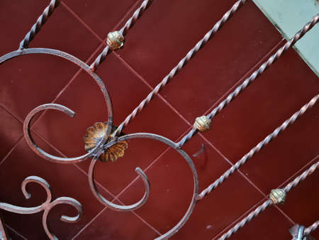 The background of the golden brown iron fence is patterned in front of the red porcelain wall and white wall paint