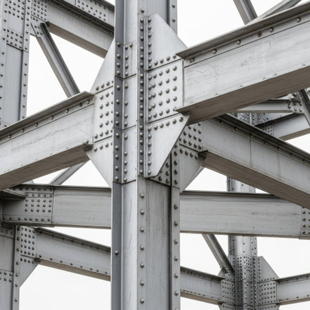 This image showcases a detailed view of a steel structure featuring riveted joints and interconnected beams set against a clean white background. The structure's complexity and the use of rivets for joining the beams are prominently displayed, highlighting the engineering and construction aspects.