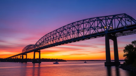 A large steel truss arch bridge spans across a wide river during a beautiful sunset or sunrise. The warm golden light of the sun reflects on the calm water, silhouetting the complex structure of the bridge against a colorful sky. The scene evokes feelings of connection, travel, and engineering prowess.